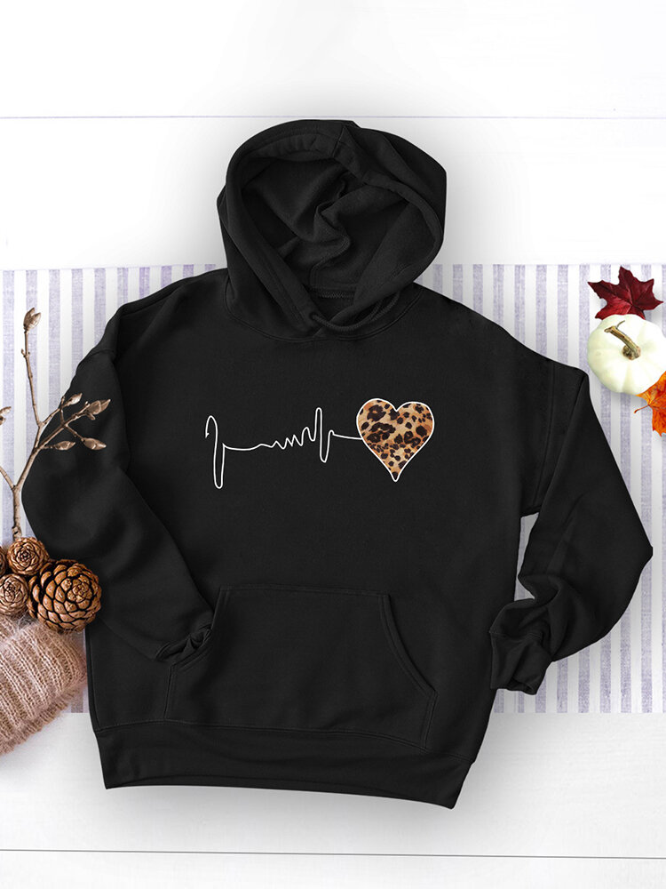 Leopard Heart Print Pocket Long Sleeves Casual Hoodie for Women