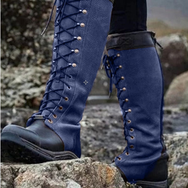 Plus Size PU Slip Resistant Stitcing Buckle Strap Lace Up Knee High Flat Boots