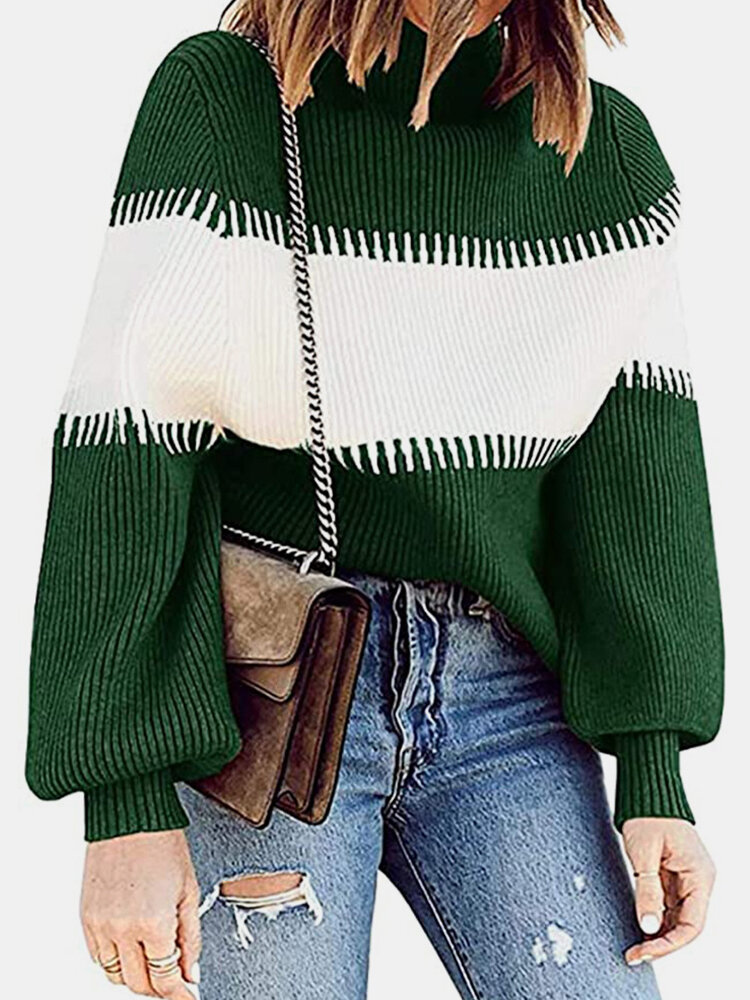Contrast Color Lantern Sleeve O-neck Sweater For Women