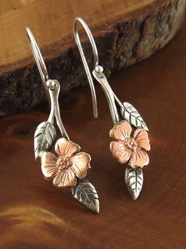 Vintage Rose Flower Leaf Women Earrings Two-Tone Symmetrical Pendant Earrings