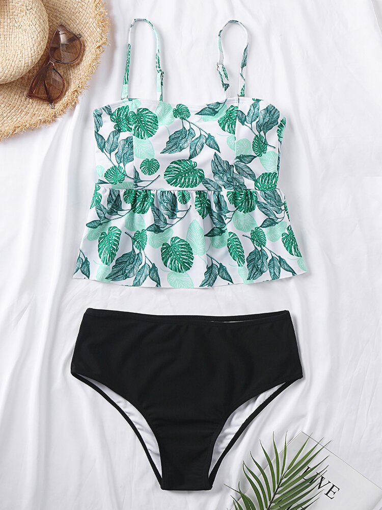 Women Leaf Print Ruffle Cover Belly Peplum Tankinis Swimsuit