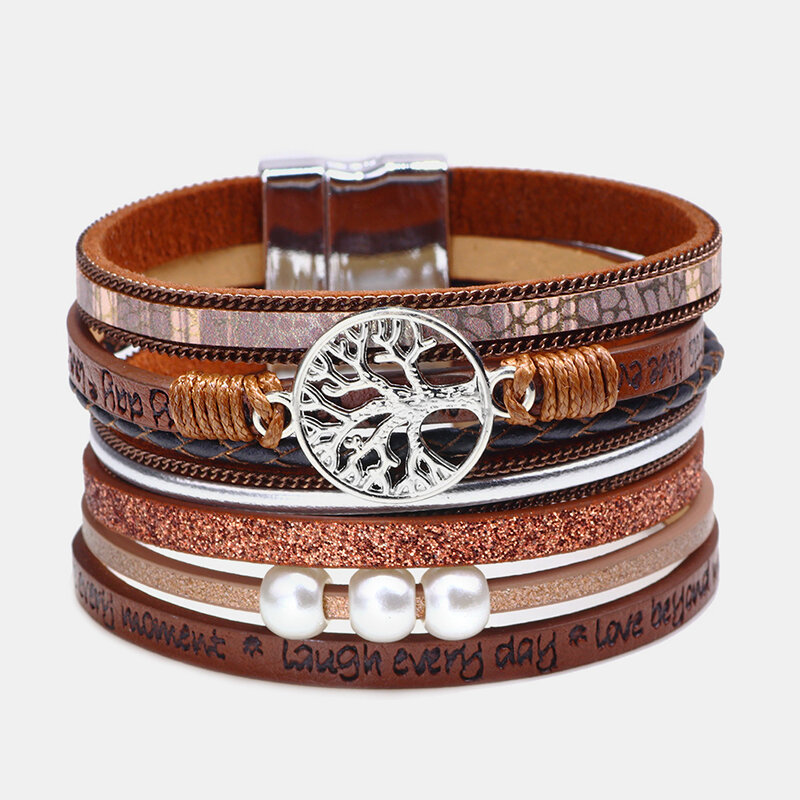 Trendy Vintage Ladies Bracelet Hollow Life Tree Embossed Alphabet Pearl Bracelet