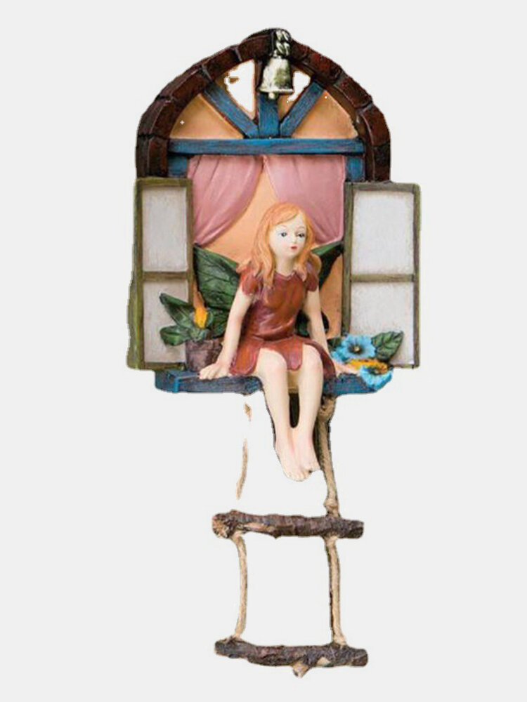 1 PC Fairy House Tree Hanging Sculpture Hand-Painted Window Sitting Fairy with Ladder Resin Statue Miniature Home Garden Decor