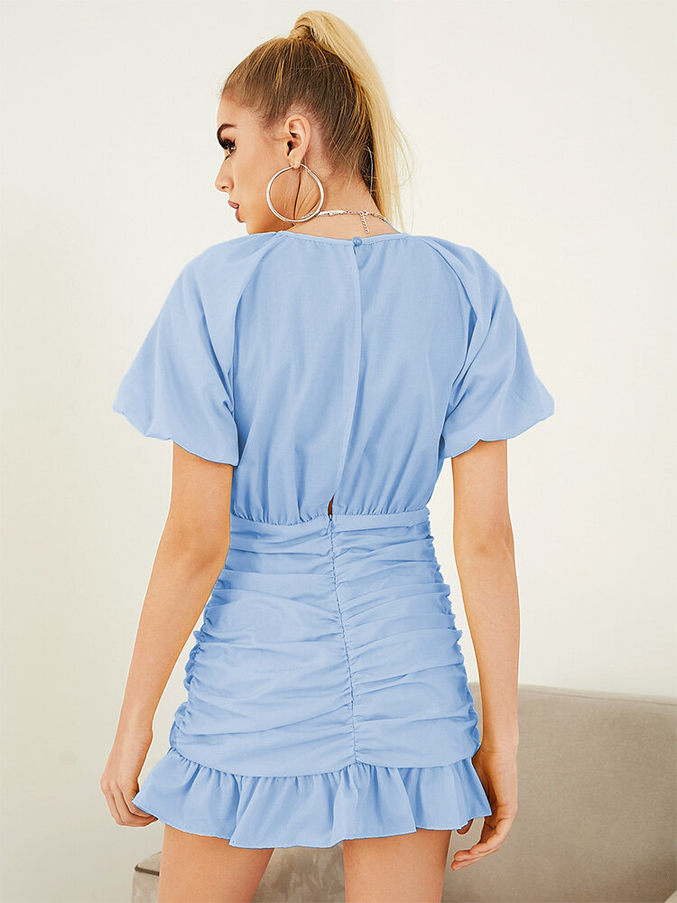 Solid Puff Sleeve Folds Ruffle Short Sleeve Casual Dress