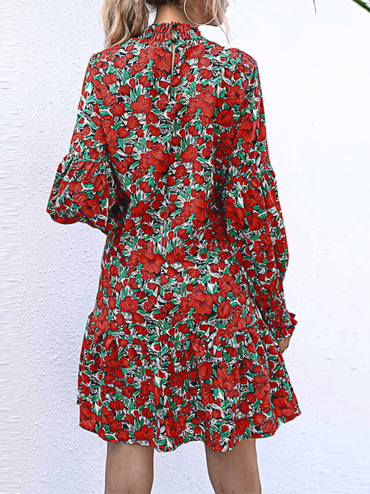 Floral Print Puff Long Sleeves Shirred Half-collar Dress