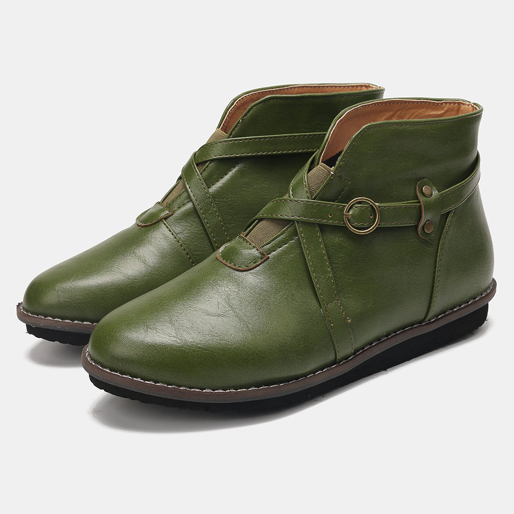Large Size Women Comfy Leather Stitching Buckle Flat Ankle Boots