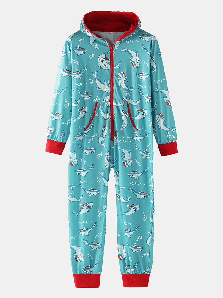 Shark Print Beam Footed Cozy Patchwork Cuffs Hooded Zipper Jumpsuits For Men