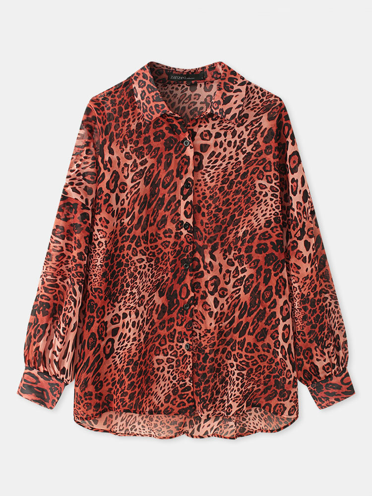 Leopard Print Lapel Long Sleeve Button Loose Blouse For Women
