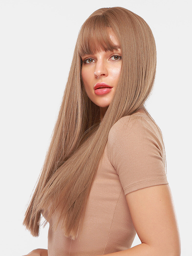 24 Inch Light Brown Long Straight Hair Full Bangs High Temperature Fiber Wigs