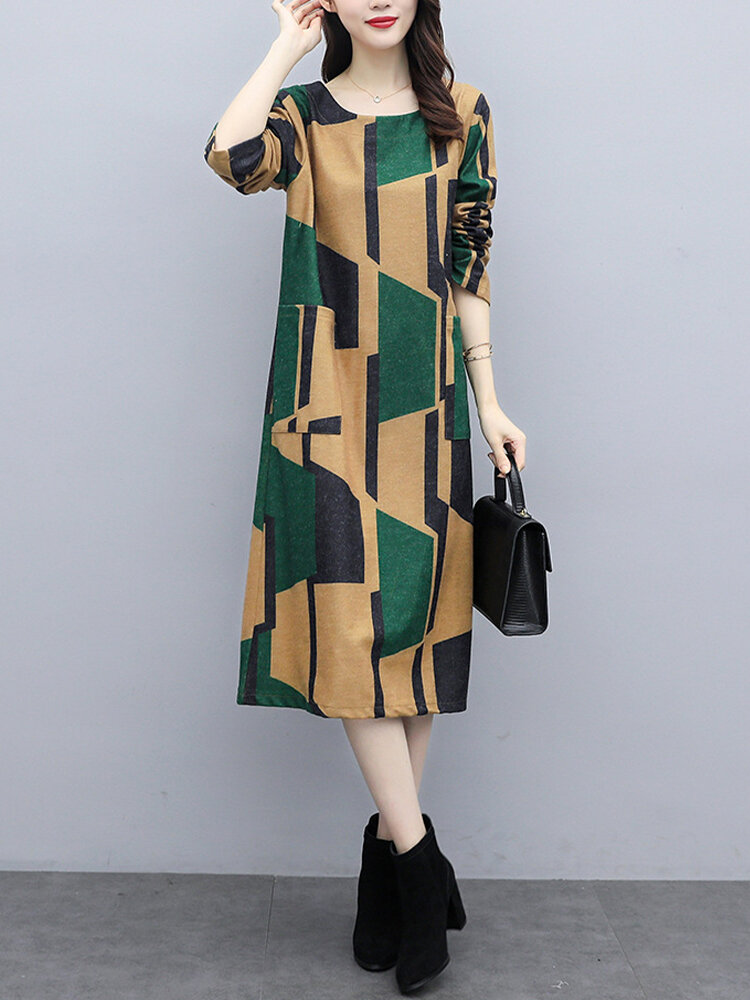 Geo Print Pocket O-neck Long Sleeve Vintage Dress