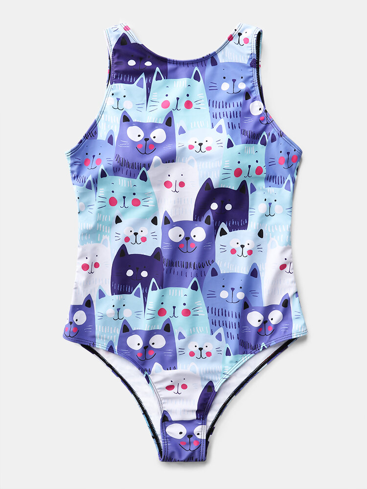 Women Cute Cartoon Cat Print High Neck One Piece Sleeveless Slimming Swimsuit
