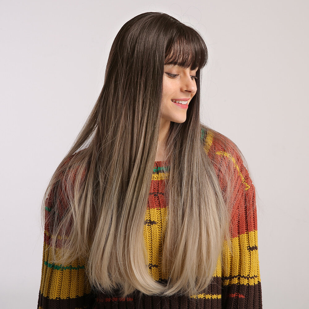 24 Inch Brown Gradient Milk Tea Color Neet Bangs Long Hair Wig Vertical Natural Soft Wig