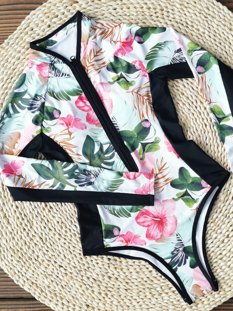 Women Patchwork Floral Print Zip High Neck Long Sleeve Slimming Surfing One Piece Swimwear