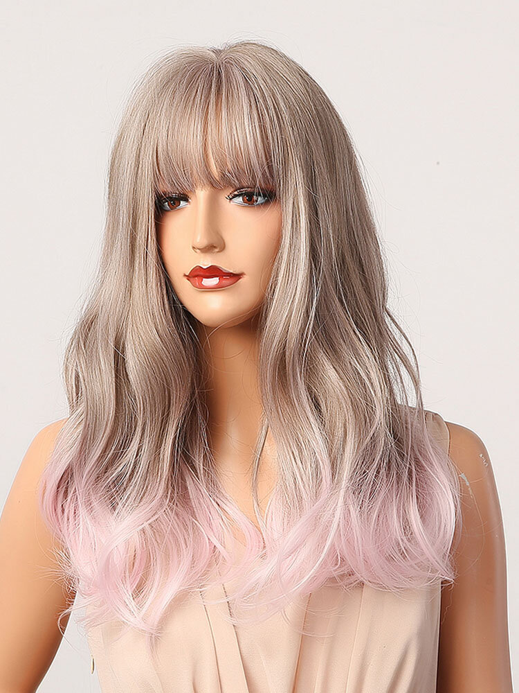 Gray-Pink Mid-length Wavy Curly Hair With Air Bangs Natural Curly Fashion Synthetic Wig For Daily Use And Masquerade