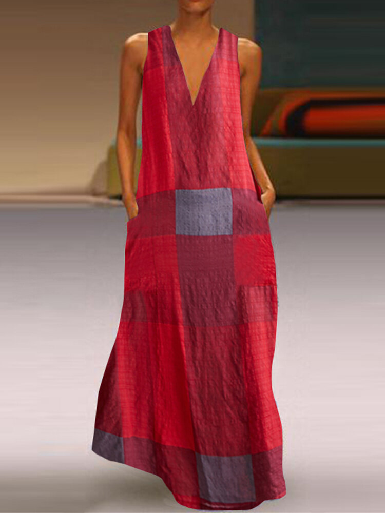 Summer Plaid V-neck Sleeveless Plus Size Maxi Dress