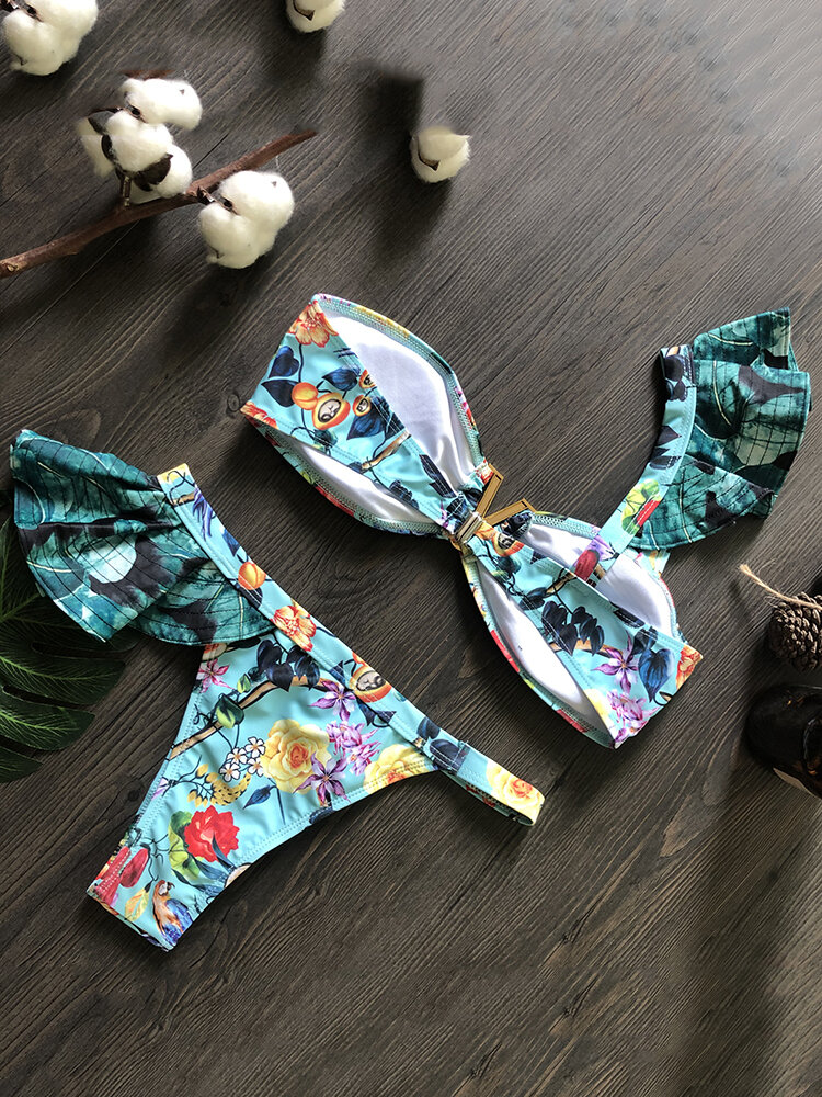 Women One Shoulder Floral Printing Bikinis Flounce Trims Backless Beachwear