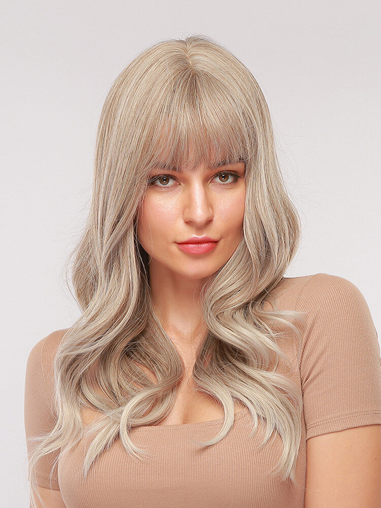 26 Inches Light Brown Golden Long Wavy Curly Hair With Air Bangs Natural Elegant Curly Synthetic Wig For Daily Use