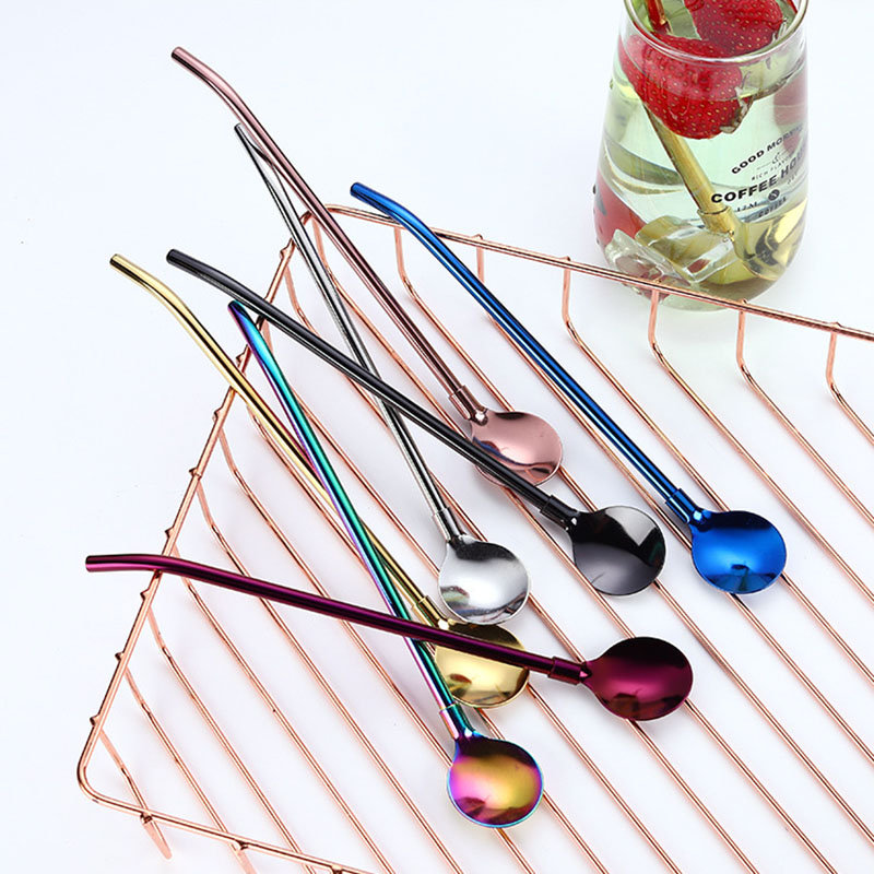 Colorful Reusable 2 In 1 Drinking Straws Spoon Stainless Steel Metal Straws Cocktail Milk Coffee
