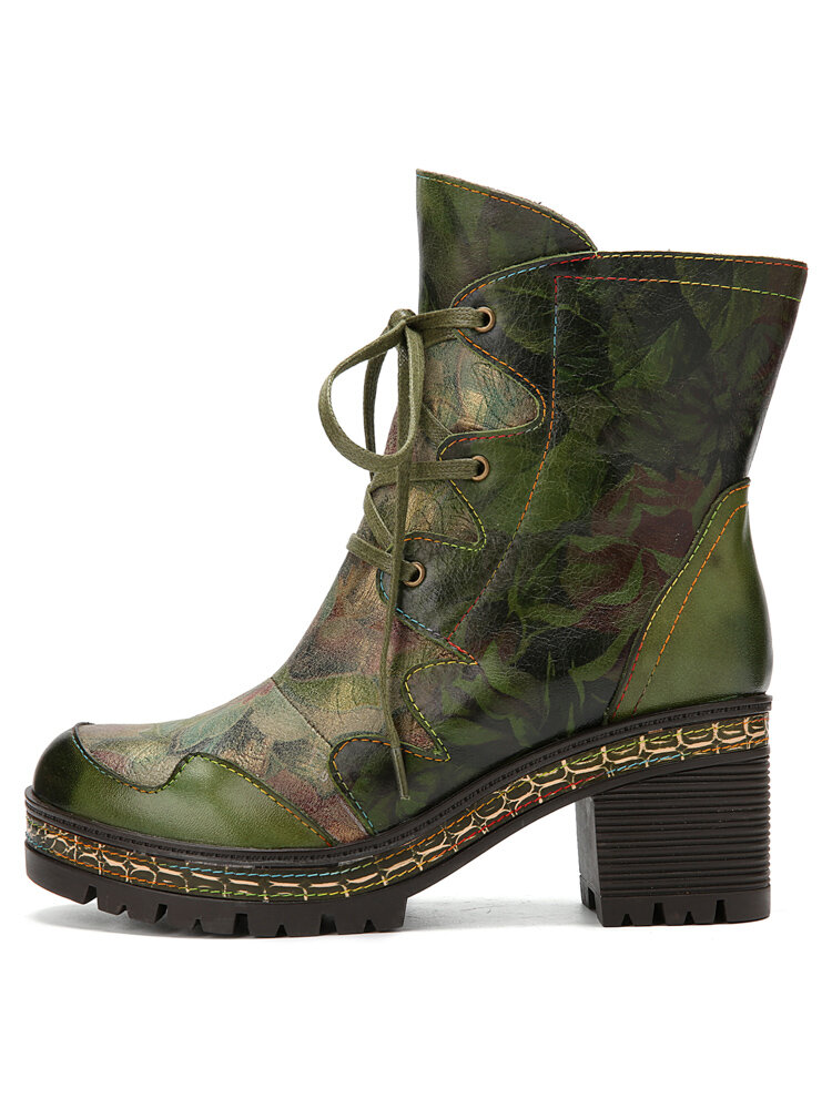 Socofy Retro Ethnic Floral Print Leather Side-zip Comfy Warm Lining Chunky Heel Short Boots