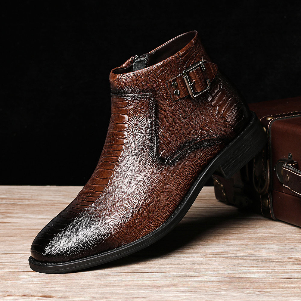 Men Cow Leather Non Slip Metal Buckle Crocodile Pattern Casual Boots