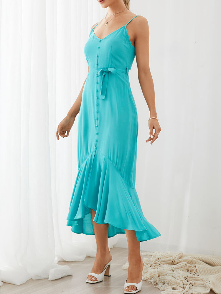 Solid Color Sleeveless Backless Knotted Breasted Ruffle Hem Strap Sexy Dress