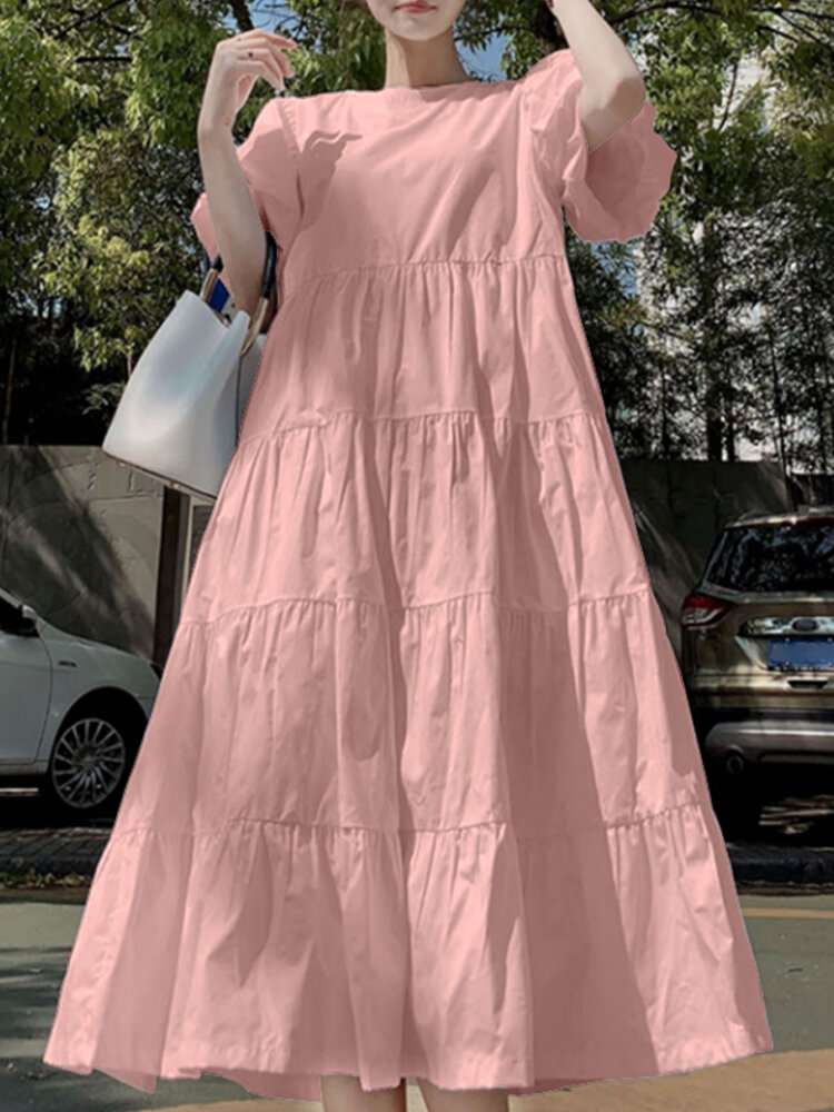 Solid Color Short Puff Sleeve Pleated Casual Loose Dress