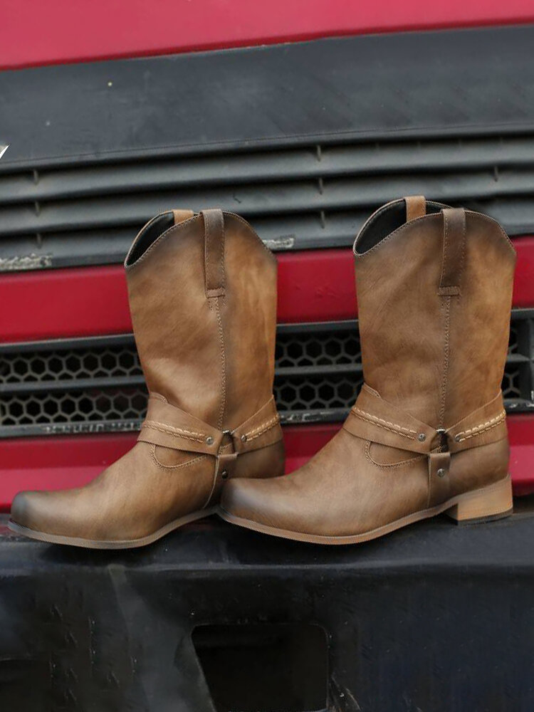 Men High Top Metal Buckle Square Toe Cow Boy Boots