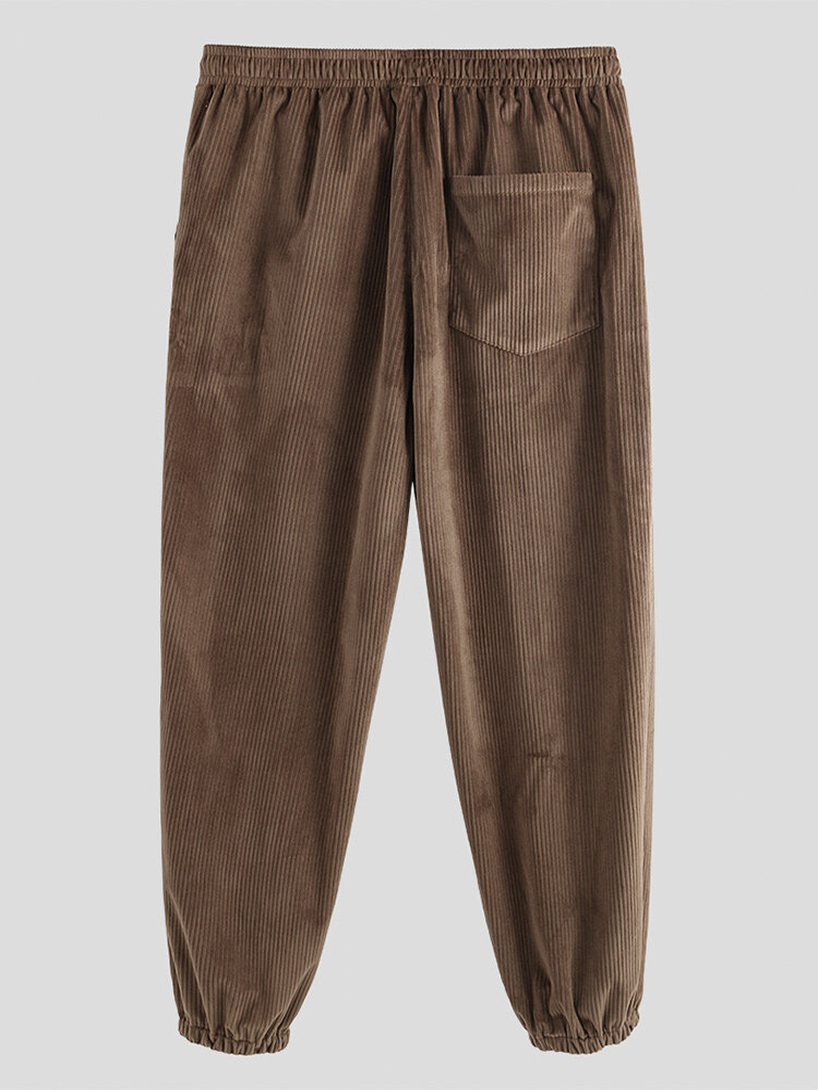 Mens Plain Corduroy Solid Color Big Pockets Ankle Banded Pants