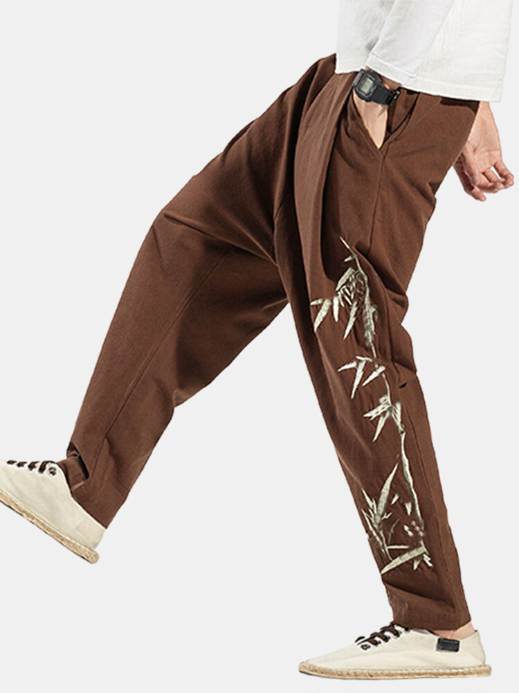 Mens Cotton Linen Embroidery Chinese style Loose Straight Harem Pants