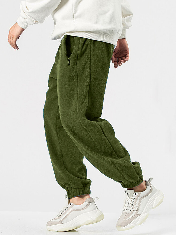 Mens Fleece Solid Color Drawstring Thick Plush Jogger Pants