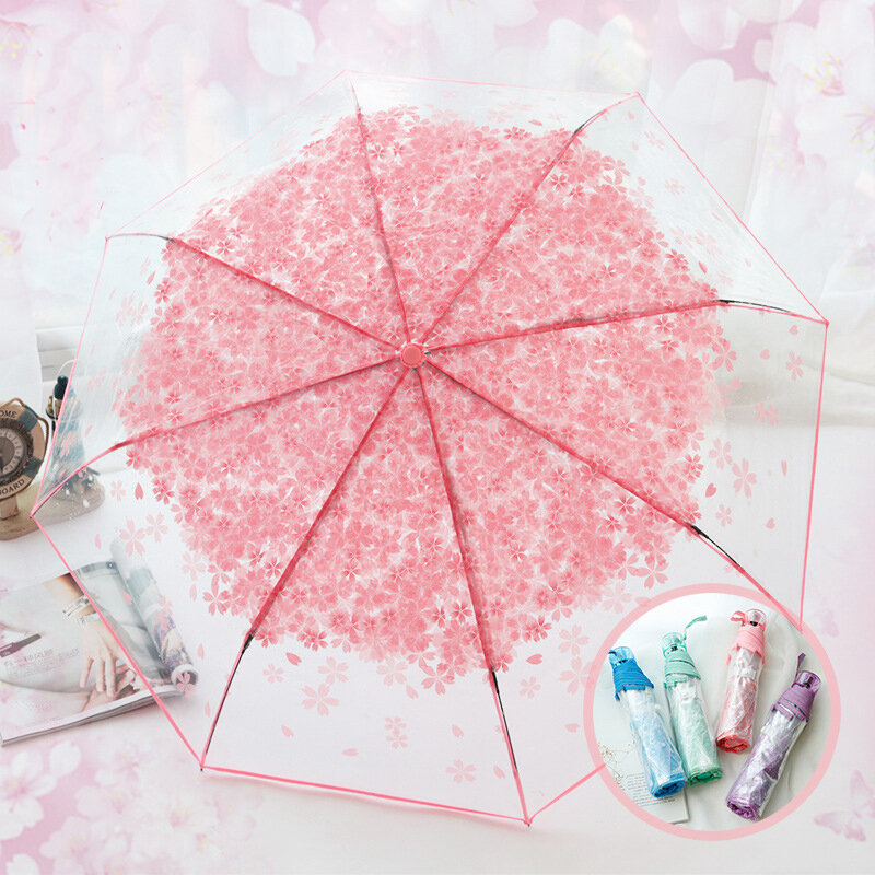 SaicleHome PEVA Romantic Cherry Blossoms Transparent Umbrella Folding Umbrella Sun Rain Gear