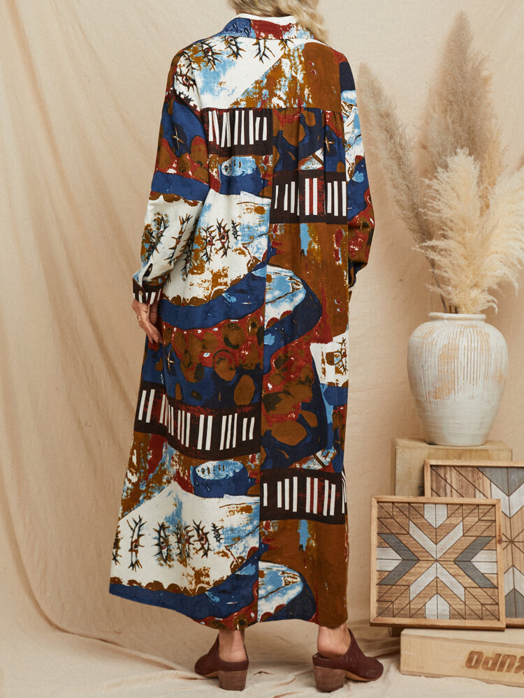 Ethnic Pattern Vintage Button Pocket Lapel Collar Print Dress