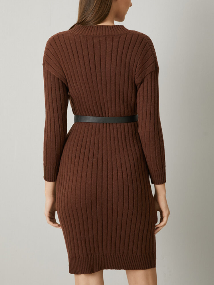 Solid Color Ribbed Knit V-neck Bodycon Women Casual Dress