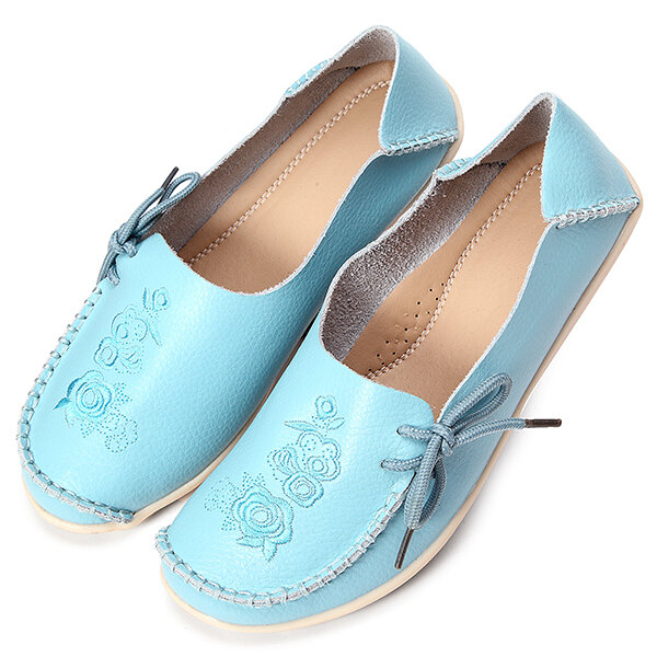 LOSTISY Women Large Size Floral Embroidery Stitching Soft Flats Leather Loafers